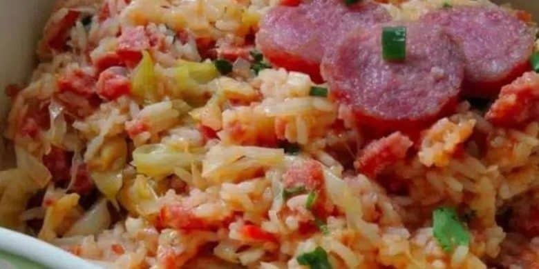 COMO FAZER ARROZ COM SALSICHA GRELHADA E REPOLHA