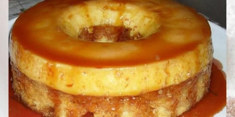 Caramelize uma assadeira redonda com a calda. Em seguida, coloque o pudim reservado e a massa do bolo por cima.