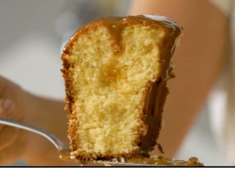Logo depois, pode esperar o bolo esfriar de pois de assado, para desenformar. Assim, leve o bolo queijadinha para um prato grande e raso, para receber a calda de doce de leite.