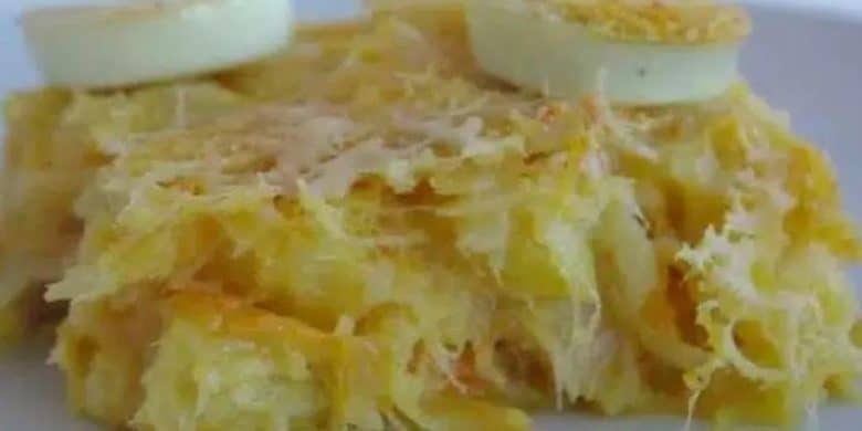 Em seguida, pegue uma caçarola de pirex ou argila, despeje a mistura de bacalhau e coloque algumas rodelas de ovo por cima, polvilhe com pão ralado e queijo ralado e leve ao forno por cerca de 20 a 25 minutos até dourar.