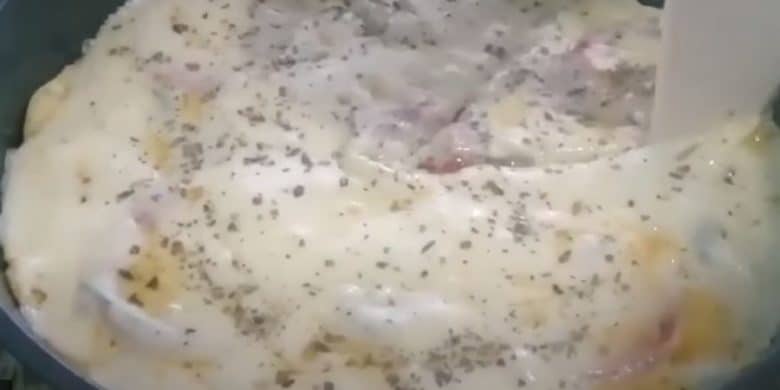 Por fim, após adicionar os ovos, tampe a panela e aguarde por 2 minutos. Depois disso, tire a tampa e adicione as fatias do queijo mussarela, salpique o orégano por cima e volte a tampar só por um tempinho, cuidando para que seja até o queijo derreter.