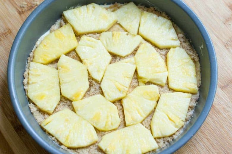 4. Disponha as fatias de abacaxi em uma única camada sobre a mistura.