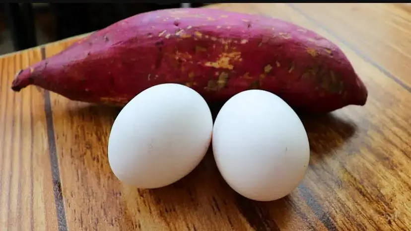 Os ingredientes necessários são 1/4 de xícara de mel (8 colheres de sopa), 2 ovos e 1 batata-doce de tamanho livre.
