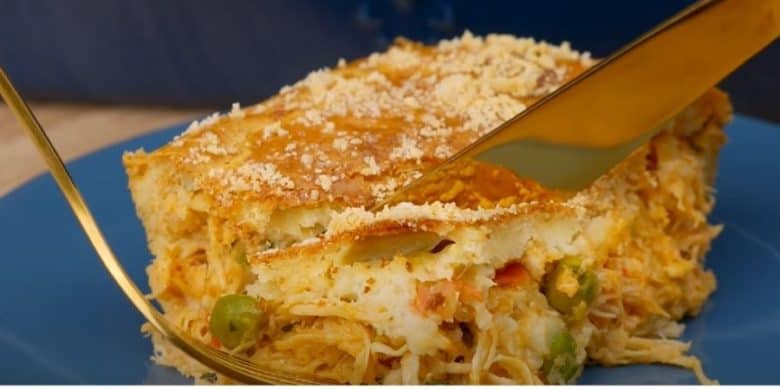 Asse o bolo no forno pré-aquecido a 200º por cerca de uma hora ou até dourar e sua torta de frango da batedeira esteja pronta!
