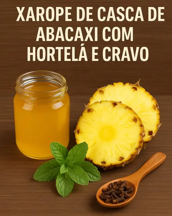 Para preparar o xarope, lave bem a casca do abacaxi e corte em pedaços. Coloque em uma panela com 1 litro de água, adicione cravos-da-índia e leve ao fogo médio. Quando ferver, abaixe o fogo e cozinhe por 30 minutos. Nos últimos 5 minutos, adicione hortelã. Coe o líquido, adicione mel ou açúcar mascavo a gosto e guarde em um vidro esterilizado na geladeira por até 7 dias.
